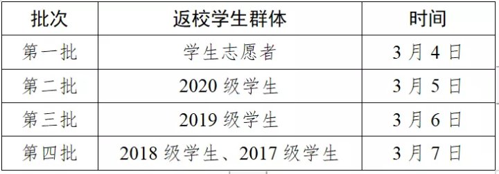 学生将分为四批返校,第一批为学生志愿者,3月4日返校;第二批为2020级学生,3月5日返校;第三批为2019级学生,3月6日返校;第四批为2018、2017级学生,3月7日返校。