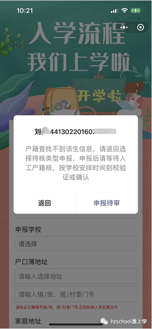 1、如果报名系统无法匹配到学生的户籍信息,请确认孩子姓名及身份证号是否输入有误,如果信息输入有误则点击“返回”更正;