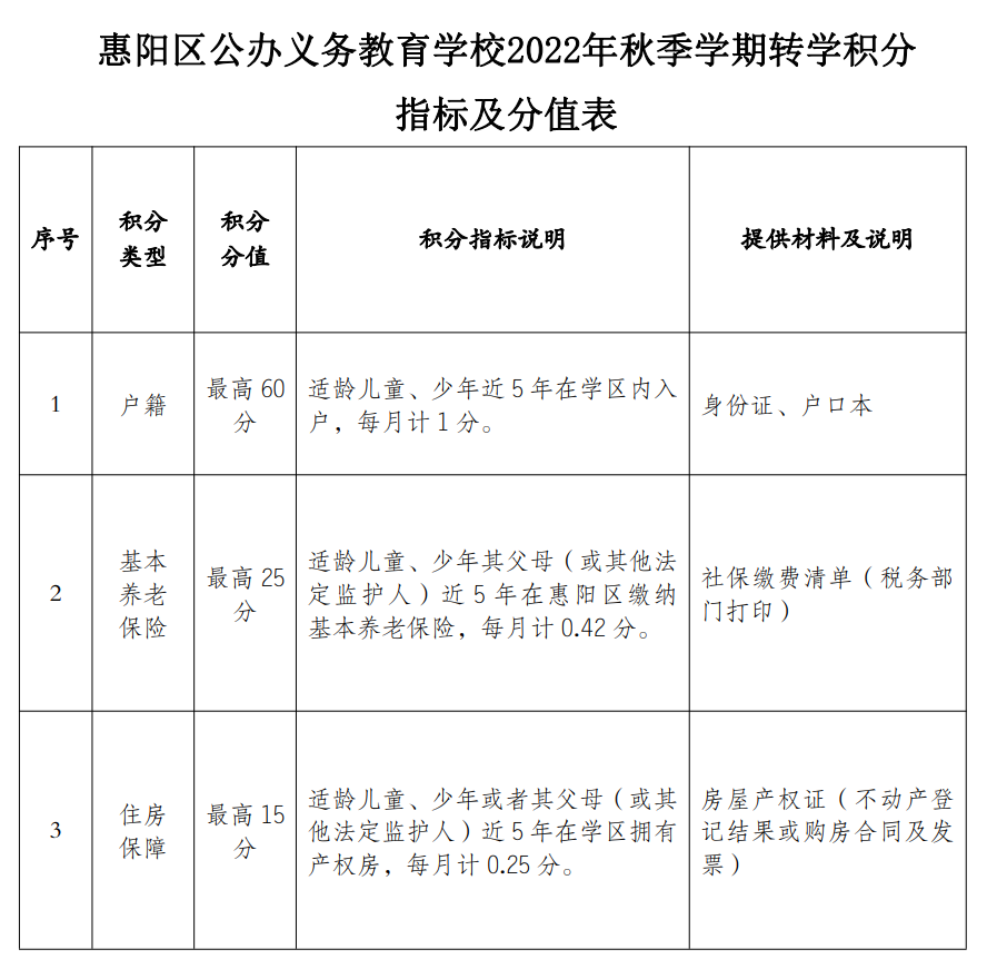 惠阳区公办学校2022年秋季插班生转学积分指标及标准表