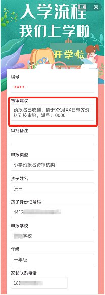 8、待学校初审完毕后,初审建议里会有学校发送的内容。请家长们有空时打开小程序查看预报名的进度。