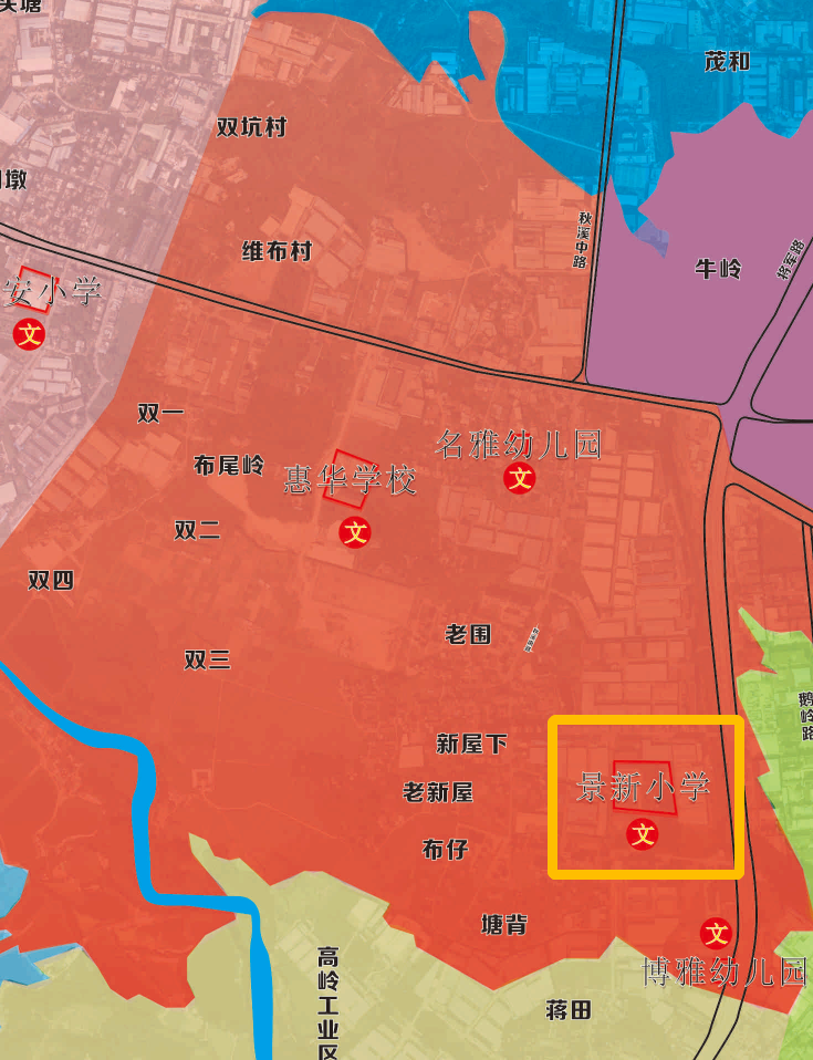 景新小学∶维布村辖区(塘背、新一、新二、新屋下、老围、老一、老二、双一双二、双三、双四、双坑村)高二小学:高岭村辖区(高布、蒋田、高岭工业区、新力臻园)