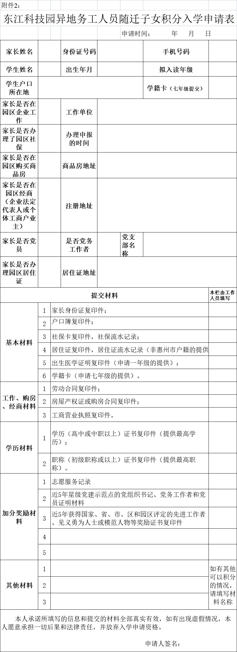 《东江科技园异地务工人员随迁子女积分入学申请表》