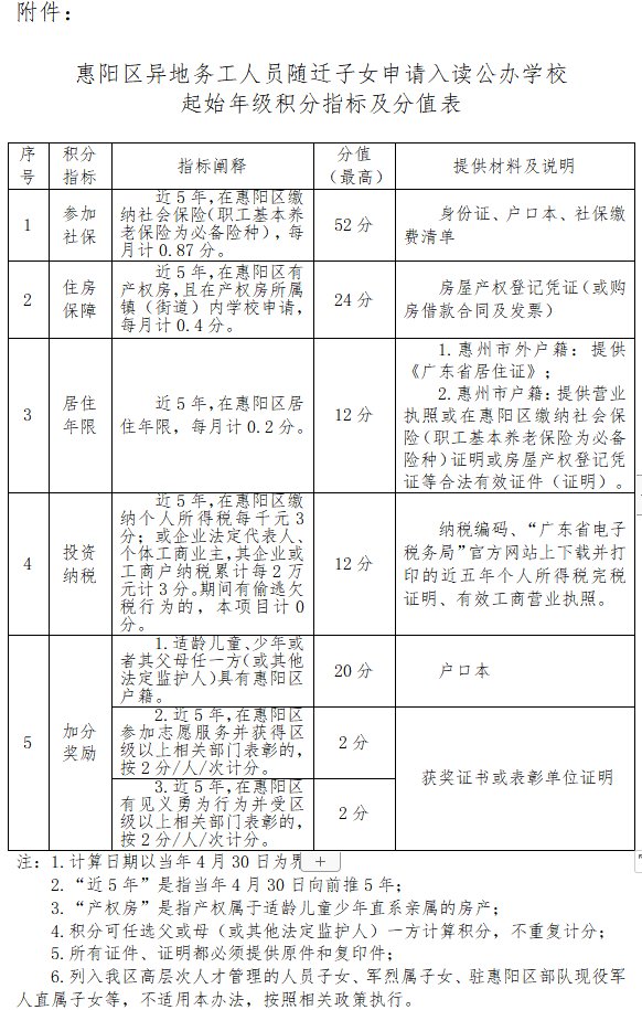 2020惠阳积分入学分值表(2020年惠阳积分入学)