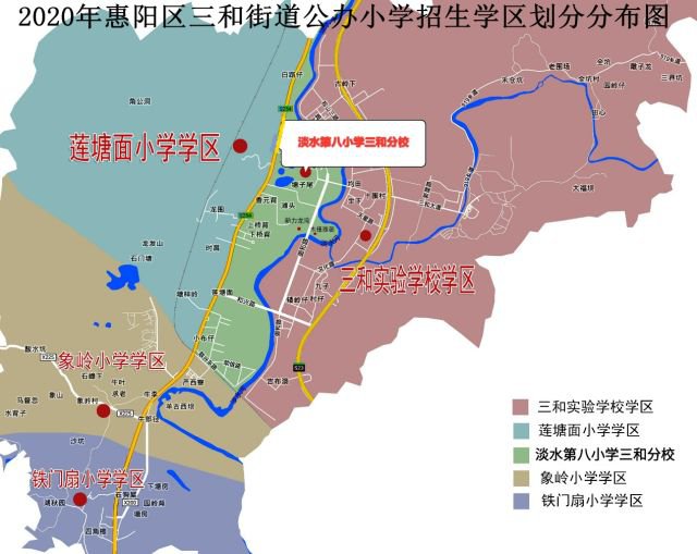在三和街道辖区,新落成招生的淡水第八小学三和分校2020年秋季学期招收一年级新生。将原属三和街道莲塘面小学学区的“东至淡水河、西至惠南大道、南至杨屋村铁路桥、北至联想工业园段”区域(含三和国际花园城、东部现代城、木槿雅著、新力珑湾、玖龙山等小区),调整为淡水第八小学三和分校学区。