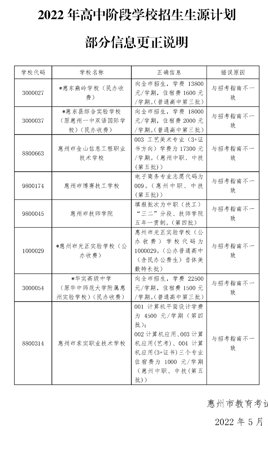 2022年惠州高中阶段学校招生生源计划部分信息更正说明