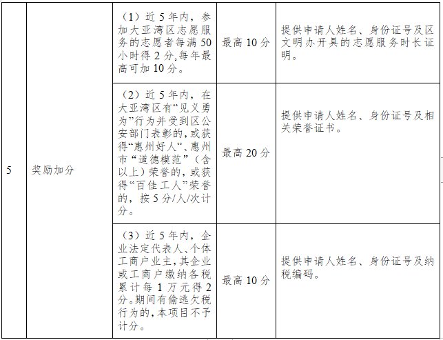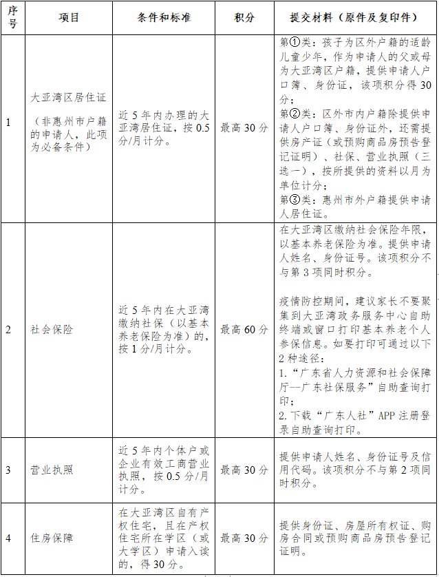 6、、以申请人父(母)或法定监护人一方在大亚湾居住年限、参保年限、投资经营情况、购房情况、志愿服务、政府嘉奖等方面情况作为计算积分的主要依据。