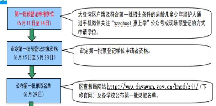 第一批:家长通过“hzschool惠上学”公众号,于6月11日早上8:00至14日下午18:00期间进入“大亚湾区公办义务教育学校户籍生网上报名系统”预登记申请学位。