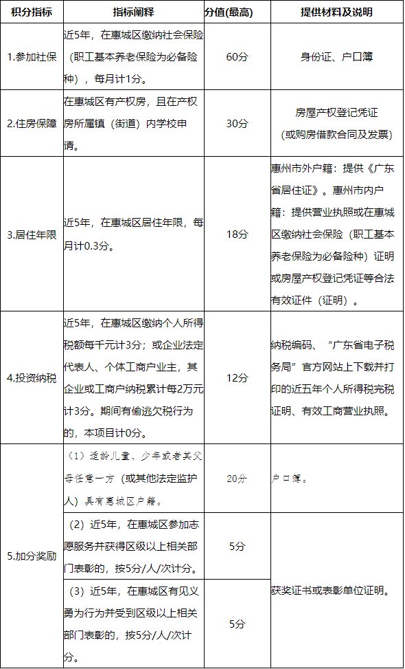 2021惠城区积分入学指标及分值表