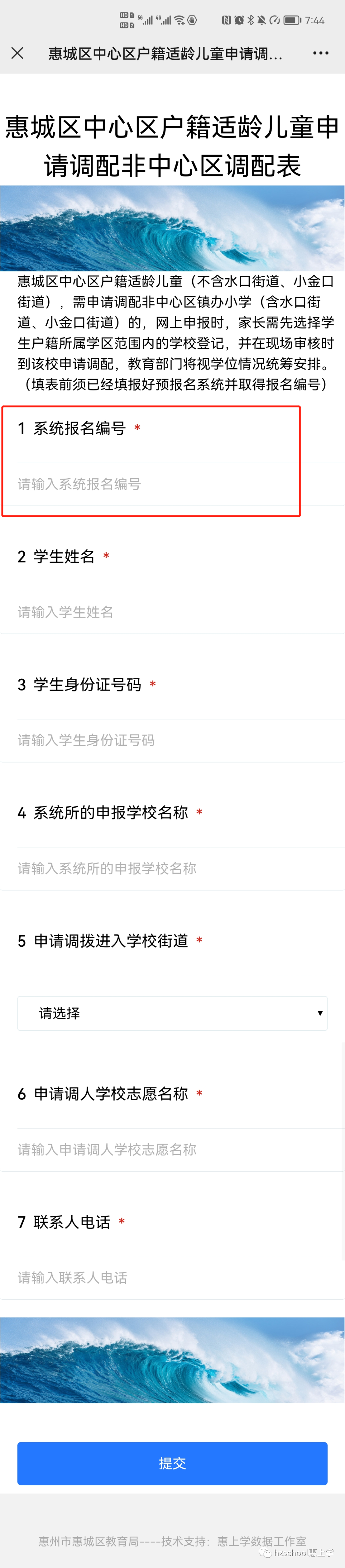 特别说明:惠城区中心区户籍适龄儿童(不含水口街道、小金口街道),需申请调配非中心区镇办小学(含水口街道、小金口街道)的,网上申报时,家长需先按系统正常户籍学校申报成功后填写申请表;惠城区教育部门将视学位情况统筹安排。