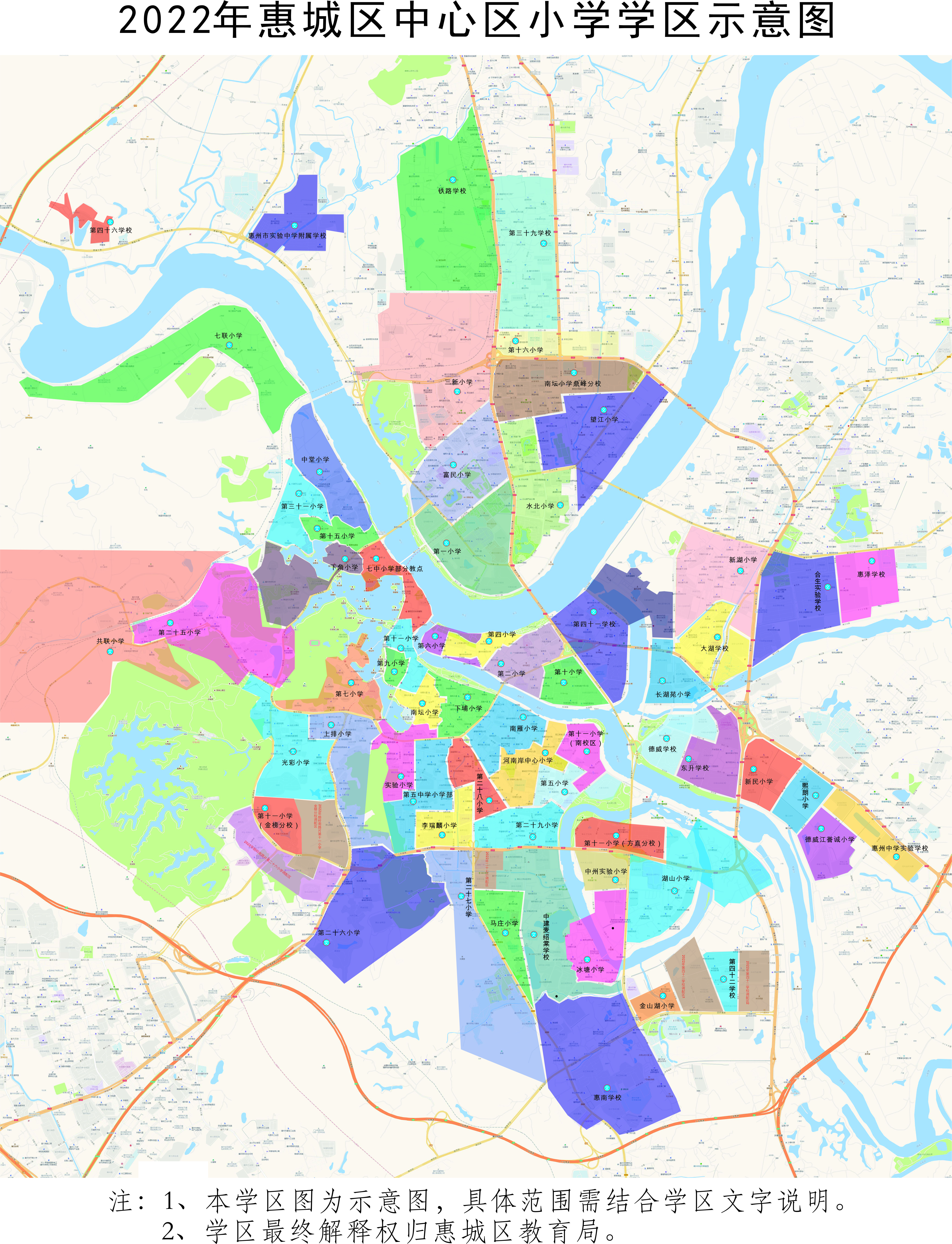 公办小学招生遵循“属地管理,划片免试相对就近入学”的原则。市区中心区(指江南、江北、桥东、桥西、河南岸、龙丰共6个街道,下同)公办学校(小学含中心区外区直属的大湖学校、新湖小学、合生实验学校、第一小学白鹭湖分校、第三十九学校、铁路学校、第四十二学校、第四十六学校、德威江誉诚小学、惠州中学附属学校、熙朗小学)由教育局依据适龄学生人数、学校分布、学校规模、交通状况等因素,按照相对就近原则划定招生区域。市区中心区小学学区范围及说明详见《2022年惠城区市区中心区小学学区示意图》和《2022年惠城区市区中心区小学学区范围说明》。因新建并开办了东升学校、惠泽学校、惠州中学附属学校、熙朗小学等4所学校,德威学校学区作了微调,并将第二小学与东坡小学进行了资源整合,其他学校按原划定学区不变。