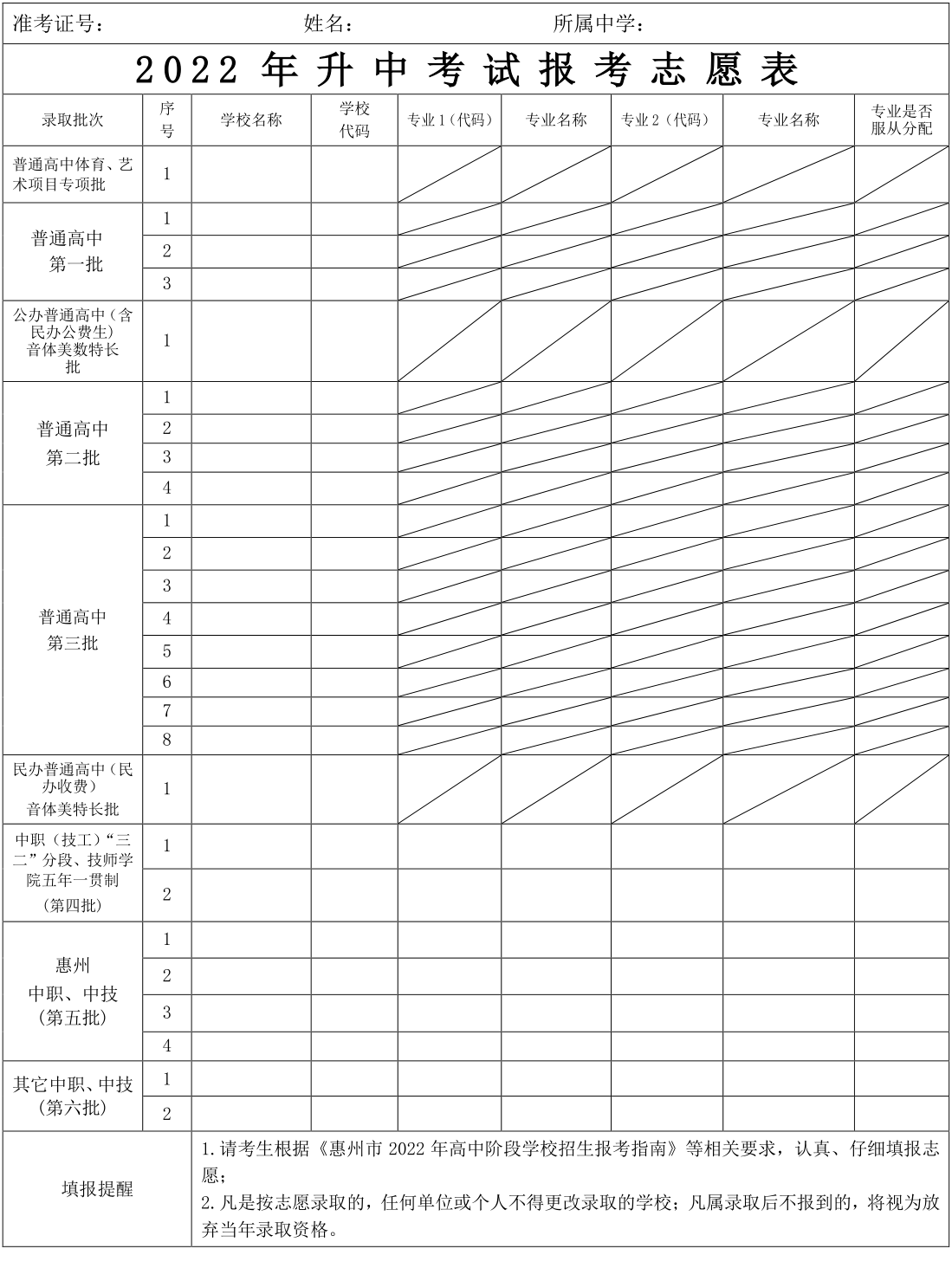 2022惠州中考志愿表格式图片(惠州市中考志愿填报时间)
