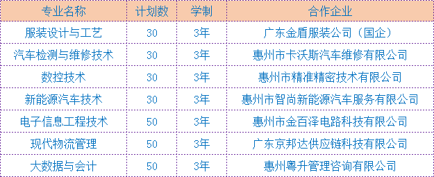 惠州经济职业技术学院7个现代学徒制专业试点,分别为服装设计与工艺、汽车检测与维修技术、数控技术、新能源汽车技术、电子信息工程技术、现代物流管理、大数据与会计,专业代码601-607,计划招生数共270人。