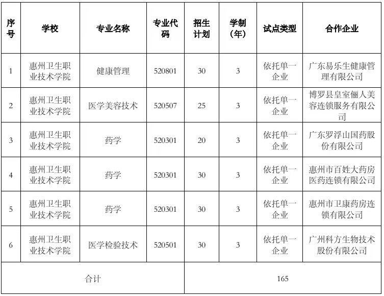 2022年自主招生(现代学徒制)试点招生计划为165人,试点专业为健康管理、医学美容技术、药学、医学检验技术4个专业,试点合作企业为广东易乐生健康管理有限公司、博罗县皇室俪人美容连锁服务有限公司、广东罗浮山国药股份有限公司、惠州市百姓大药房医药连锁有限公司、惠州市卫康药房连锁有限公司、广州科方生物技术股份有限公司。
