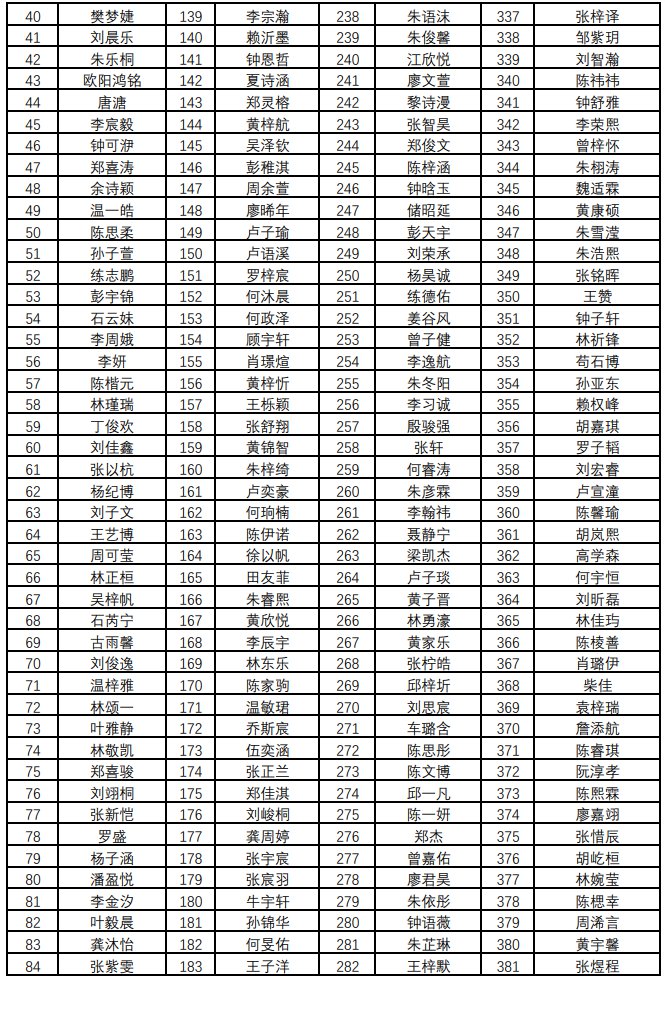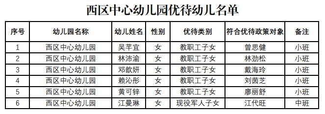 根据《2021年大亚湾区公办幼儿园招生工作方案》和《大亚湾西区中心幼儿园2021年秋季招生方案》,大亚湾西区幼儿园于2021年6月25日至28日进行新生预报名登记,经相关部门审核,符合优待条件幼儿6人,符合预报名条件幼儿645人。现将名单进行公示,公示期为2021年7月8日至14日,公示期内如有异议,可实名反映,投诉电话:5191520(幼儿园)、5562161(区宣教局)