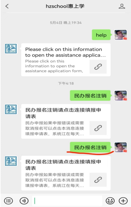 需要注销重新申报的家长,请按以下格式发送信息至惠上学公众号。