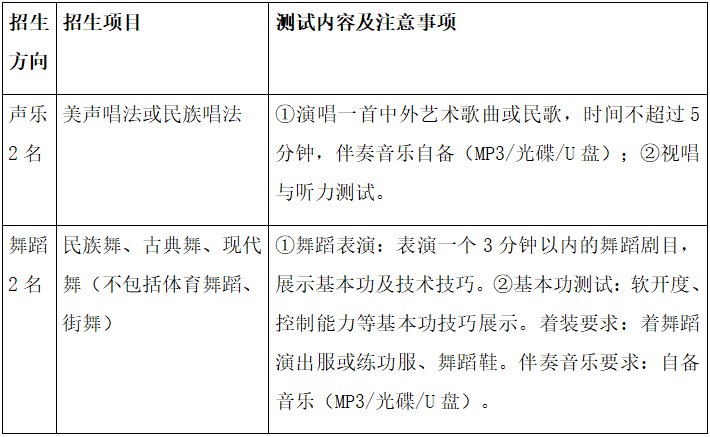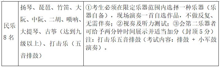 2.音乐12人。其中声乐2人,舞蹈2人,民乐8人。
