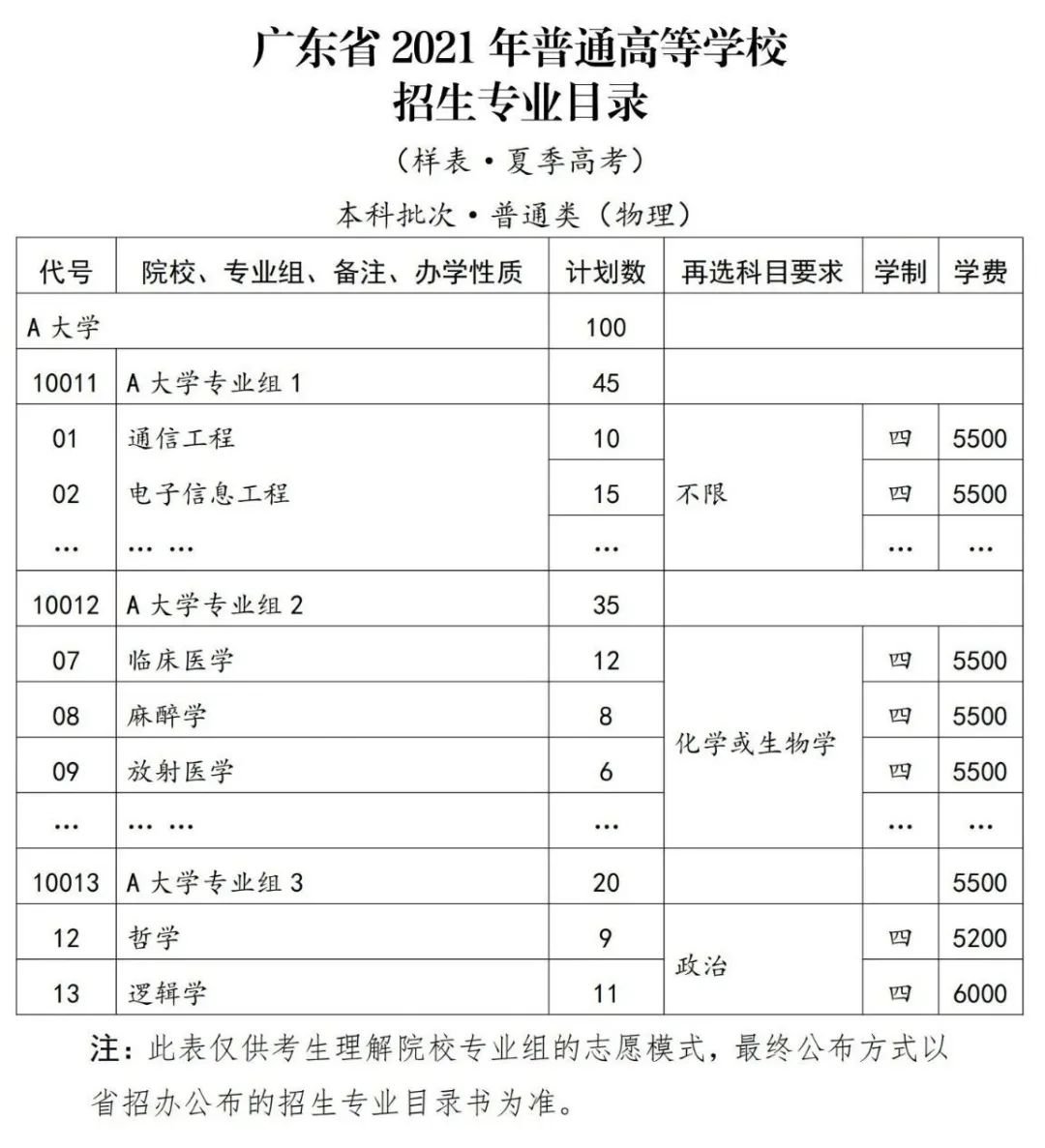 如考生首选科目为物理,再选科目为化学、生物学拟报考A大学通信工程和临床医学2个专业,则应填报 “A大学专业组1”和“A大学专业组2”两个院校专业组志愿,并分别在两个院校专业组中填报通信工程、临床医学专业志愿(《广东省2021年普通高等学校招生专业目录(样表·夏季高考)》见下表)。
