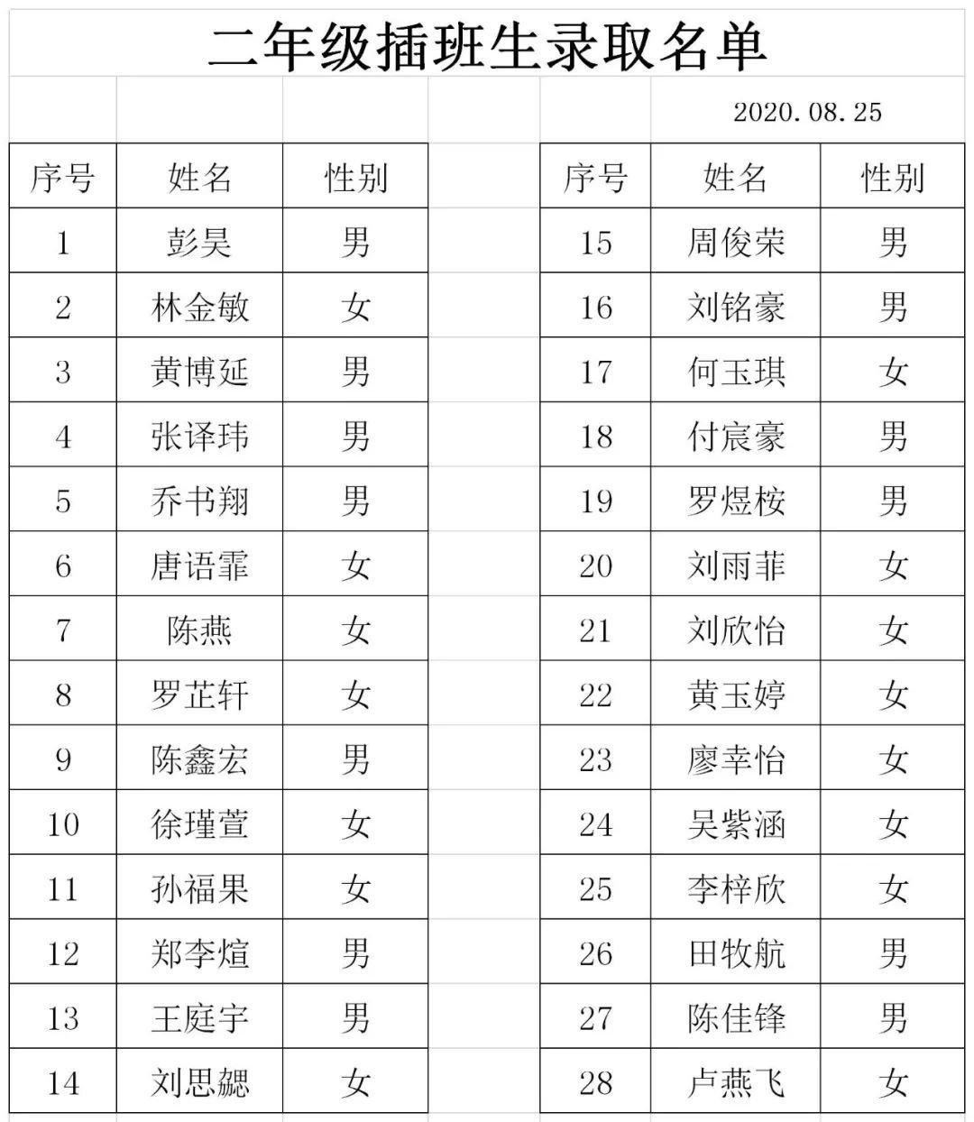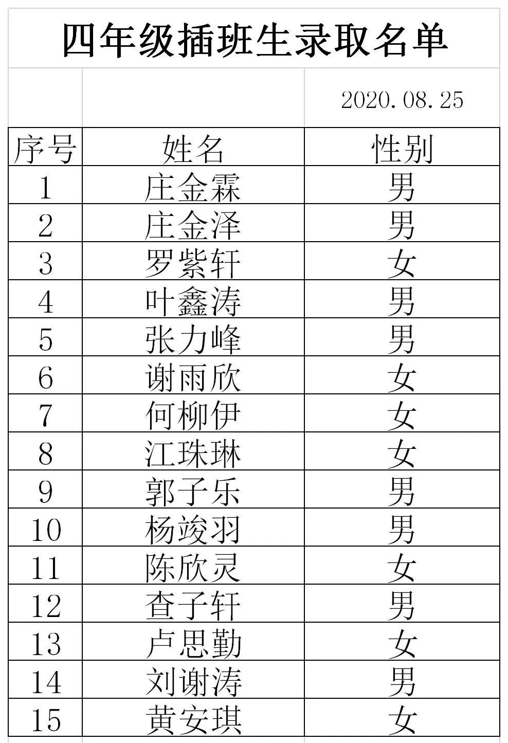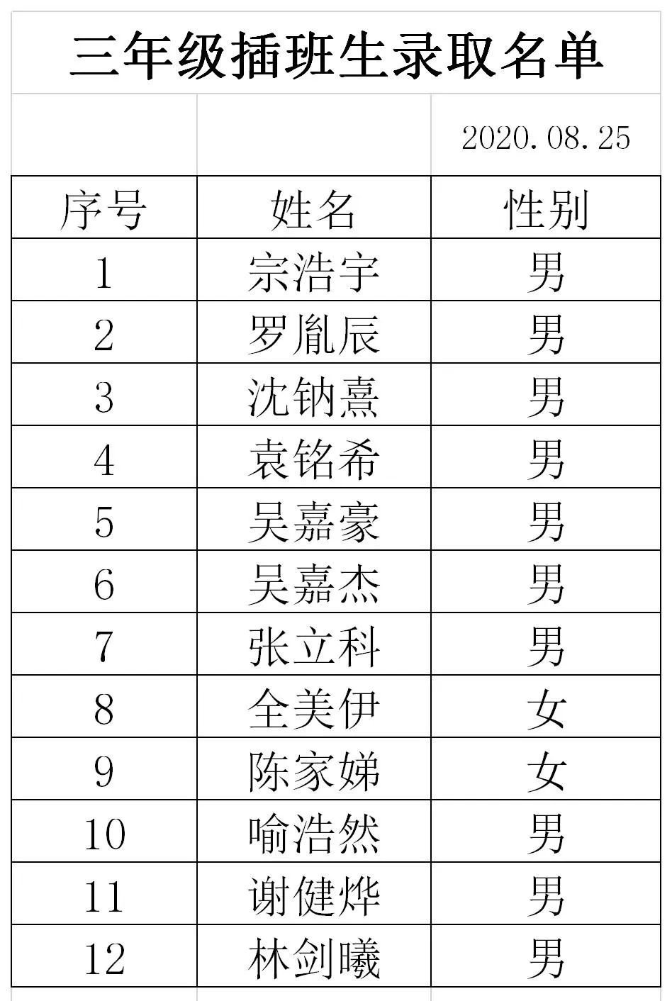 2020大亚湾西区实验学校秋季插班生拟录取名单公示