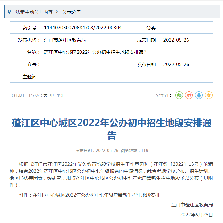 根据《江门市蓬江区2022年义务教育阶段学校招生工作意见》(蓬江教〔2022〕13号)的精神,结合2022年蓬江区中心城区公办初中七年级报名的生源情况,综合考虑学校分布、招生计划、街区形状等因素,经研究,现将蓬江区中心城区公办初中七年级户籍新生招生地段予以公布