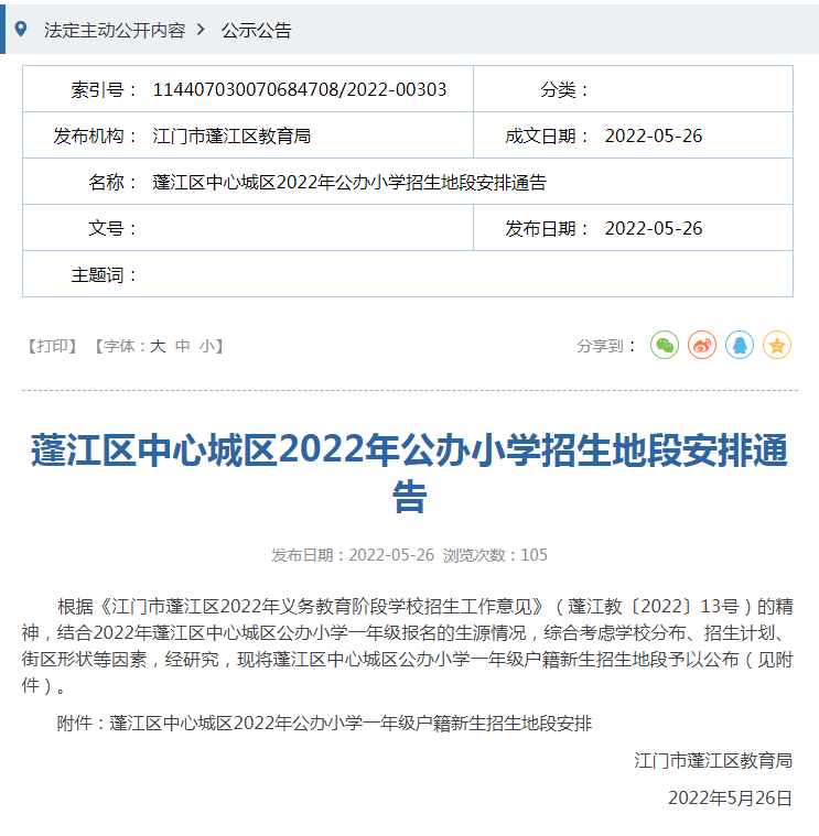 根据《江门市蓬江区2022年义务教育阶段学校招生工作意见》(蓬江教〔2022〕13号)的精神,结合2022年蓬江区中心城区公办小学一年级报名的生源情况,综合考虑学校分布、招生计划、街区形状等因素,经研究,现将蓬江区中心城区公办小学一年级户籍新生招生地段予以公布: