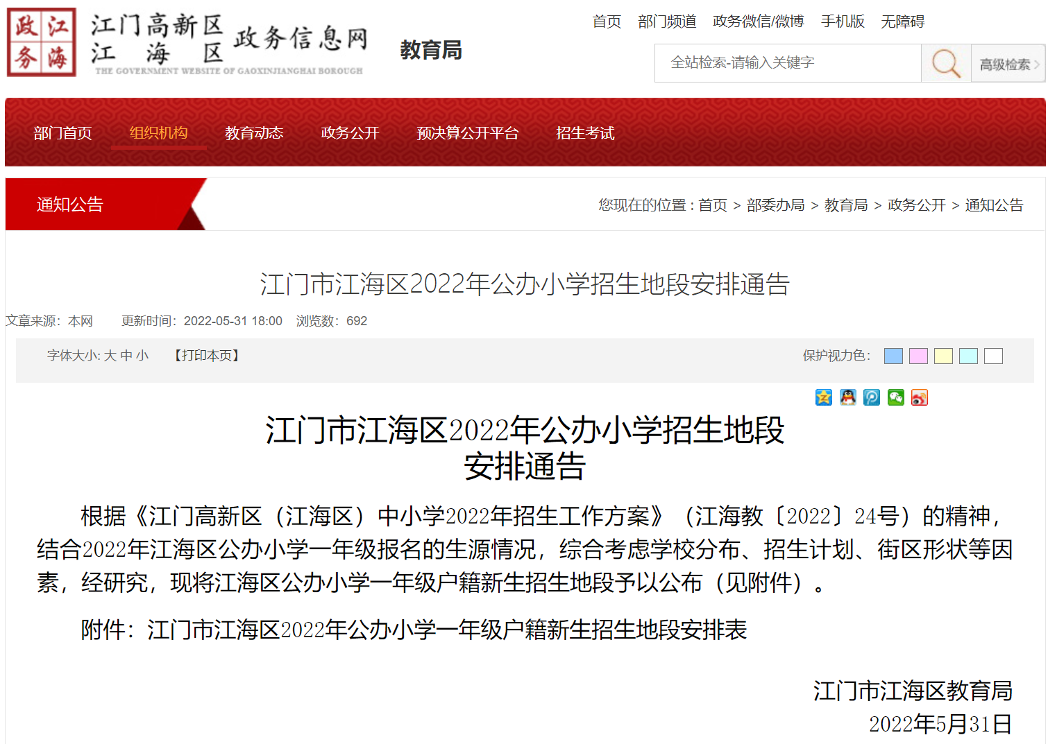 江门市江海区2022年公办小学一年级户籍新生招生地段安排表