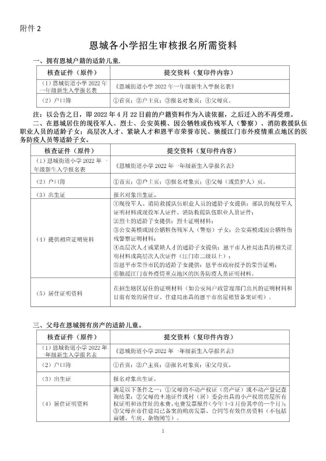 2.恩城各小学招生审核报名所需资料