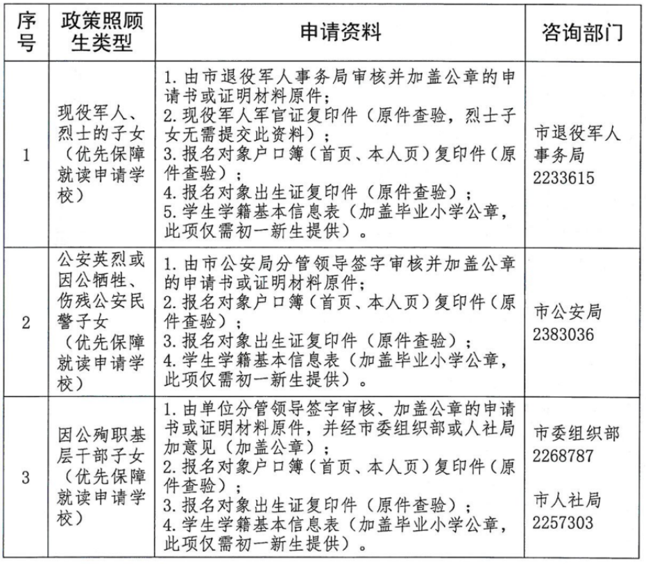 符合政策照顾生条件的适龄儿童(少年)家长,需于5月20日前提交相关材料到政府相应职能部门提出申请,由职能部门统一收集申请资料、核定资格,逾期不再受理申请。申请资料详见下表: