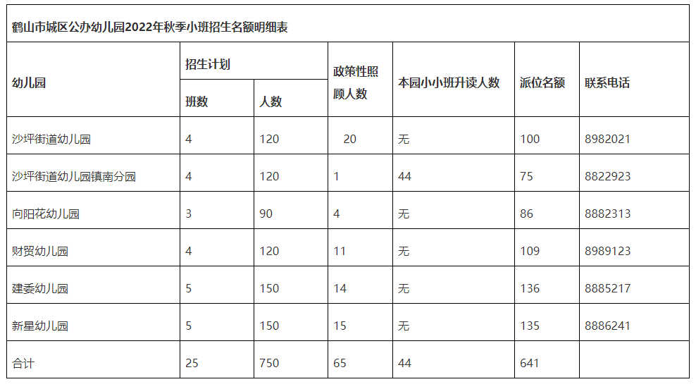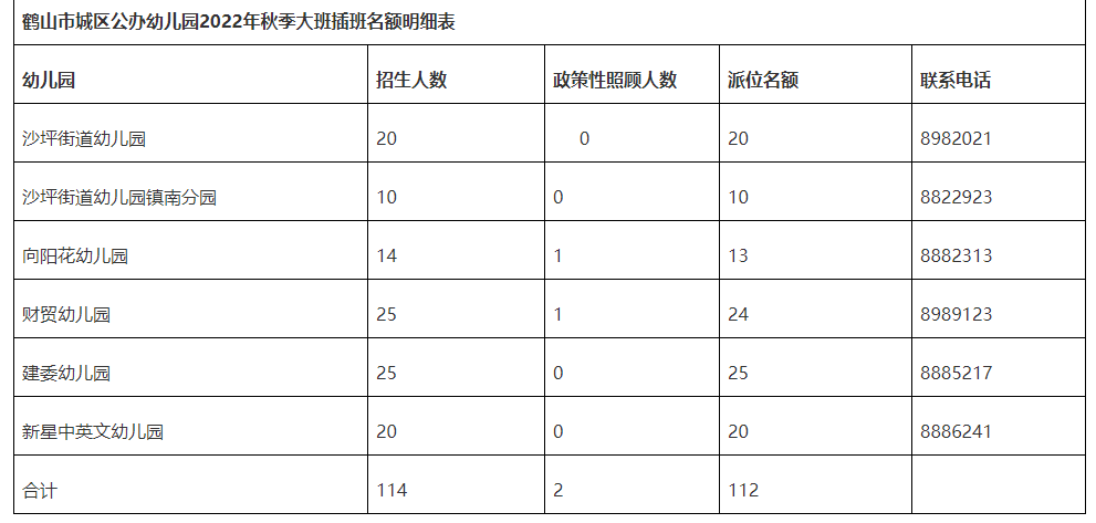 鹤山市沙坪街道幼儿园、鹤山市沙坪街道幼儿园镇南分园、鹤山市向阳花幼儿园、鹤山市财贸幼儿园、鹤山市建委幼儿园、鹤山市新星幼儿园6所城区公办幼儿园2022年秋季小班招生和中班、大班插班招生报名同时进行,每位适龄幼儿只能选择其中一所幼儿园报名。