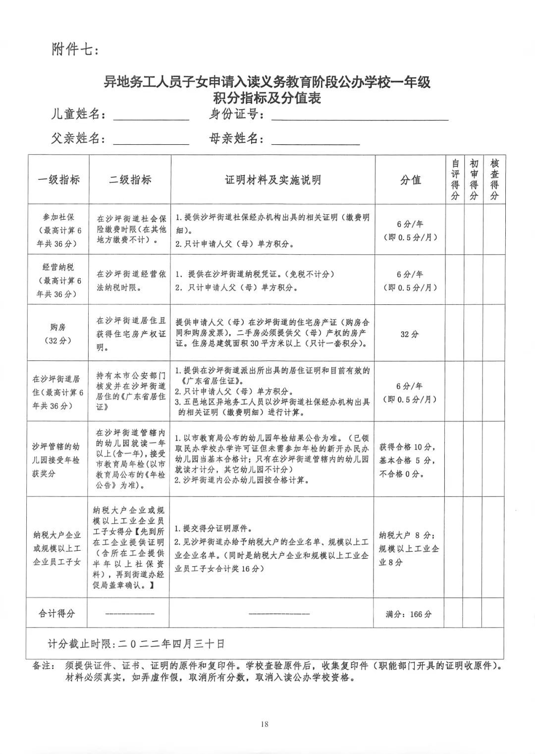 在安排沙坪户籍适龄儿童和符合条件的政策性照顾生的入读后,且在有学位剩余的情况下,由中心校根据街道内的学位情况,按异地务工人员子女入学积分由高分到低分的顺序安排入读公办学校(详情见【附件七】 积分表),额满即止。异地务工人员子女必须服从统筹安排,否则被视为放弃入学资格。未获入学资格的异地务工人员子女,自行联系民办学校入读或回户籍所在地就读。