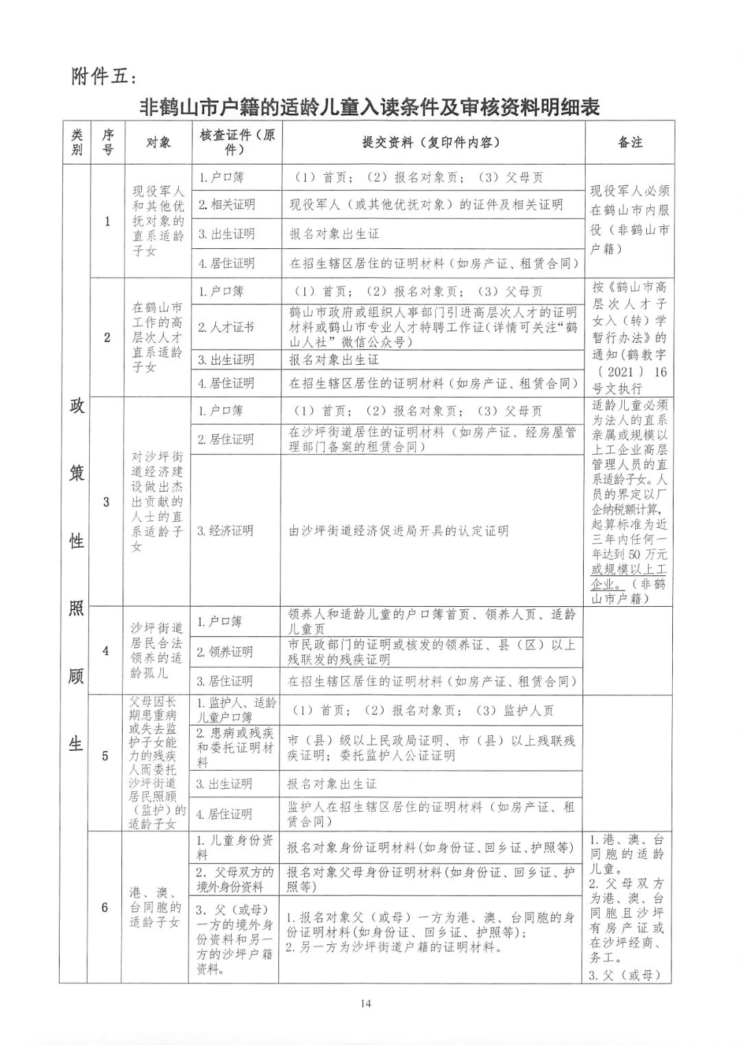 (二)政策性照顾生:符合政策性照顾条件之一的非鹤山市户籍的适龄儿童(见附件五《非鹤山市户籍的适龄儿童入读条件及审核资料明细表》序号1-7),在满足沙坪街道户籍适龄儿童入学后,沙坪街道中心小学(下文简称"中心校")根据公办学校学位剩余情况,统筹安排政策性照顾生入读公办学校。