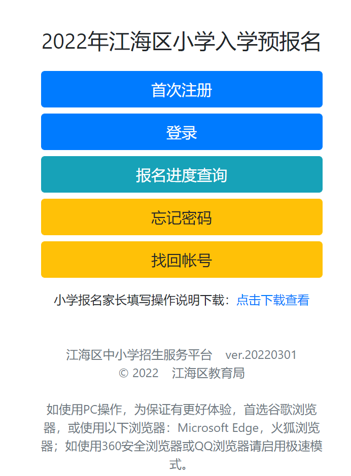 江海区2022年秋季公办小学一年级报名网上申请