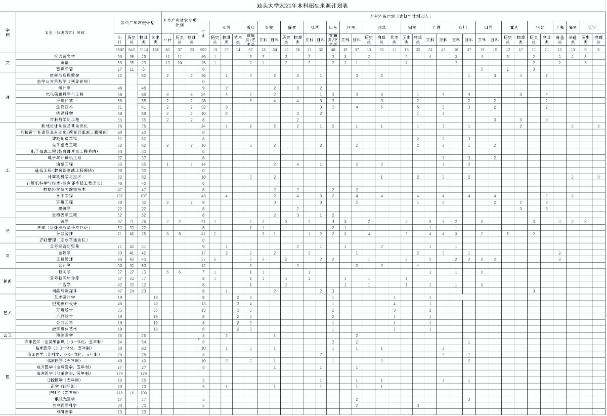 2021汕头大学本科招生来源计划表 2021汕头大学本科招生来源计划表格