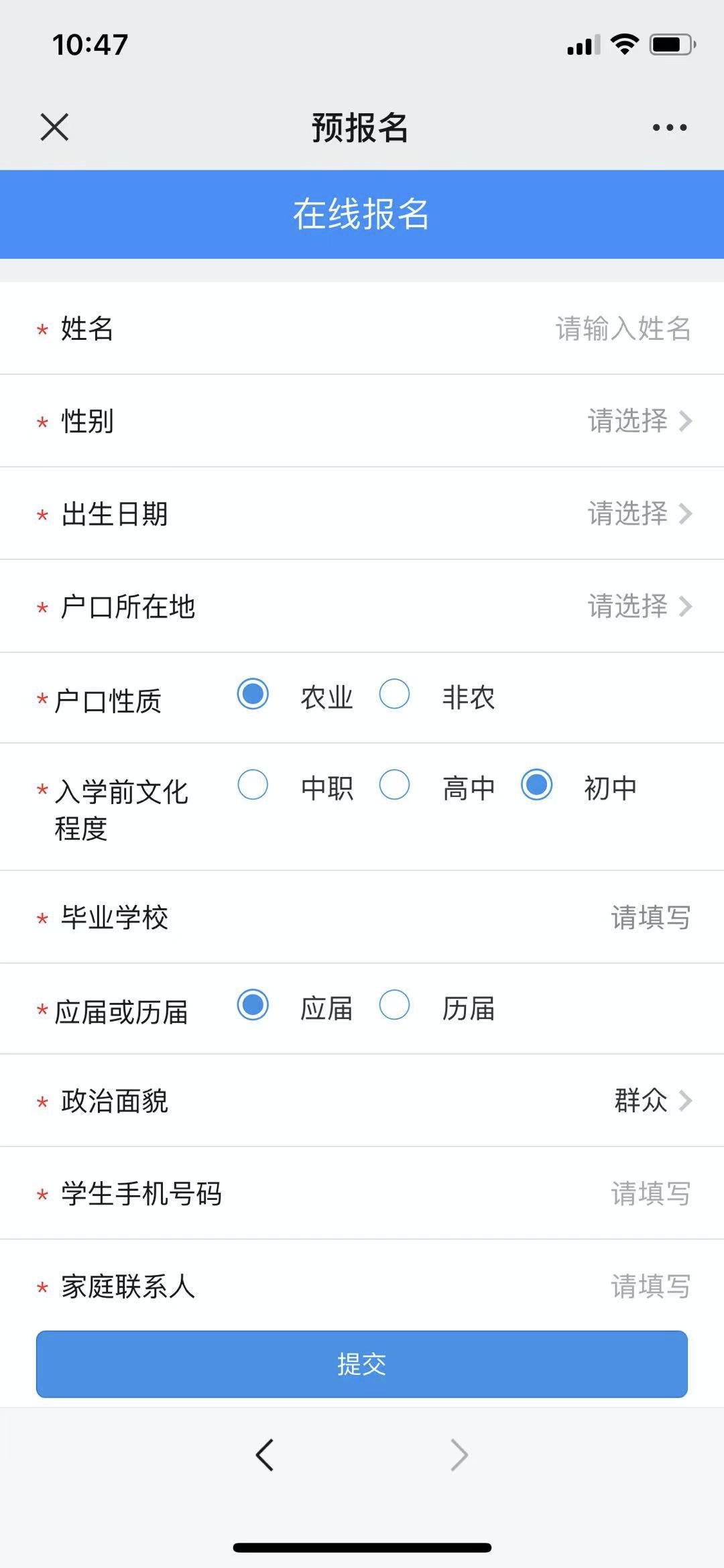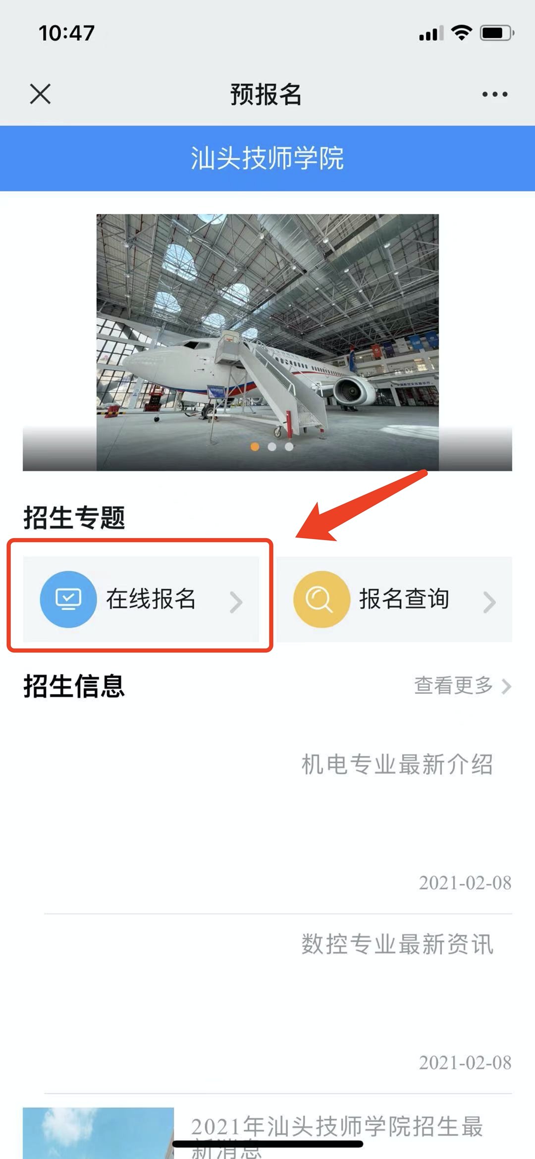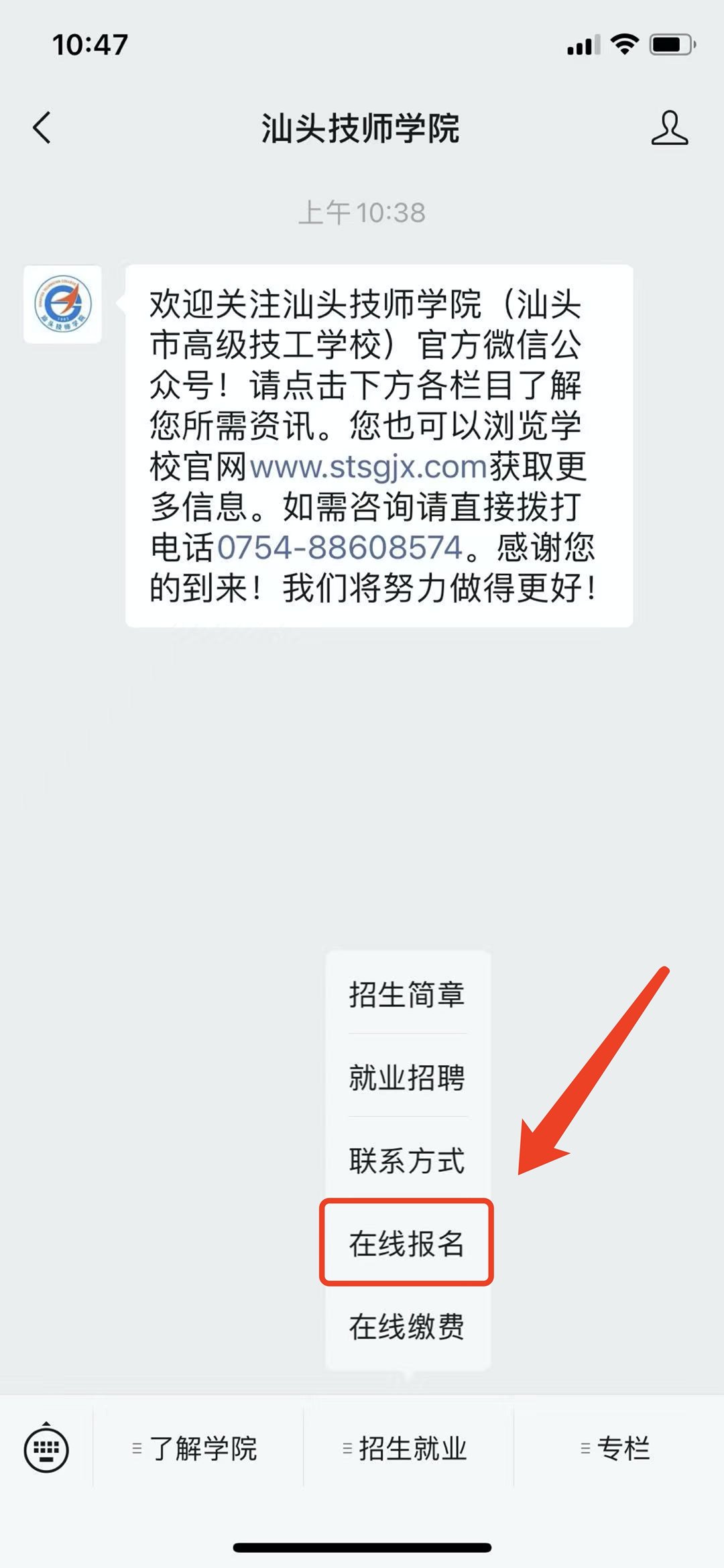 1、线上报名:打开微信,搜索“汕头技师学院"公众号,点击下方“招生就业”功能键,进入“在线报名”,填写学生个人信息后点击提交。