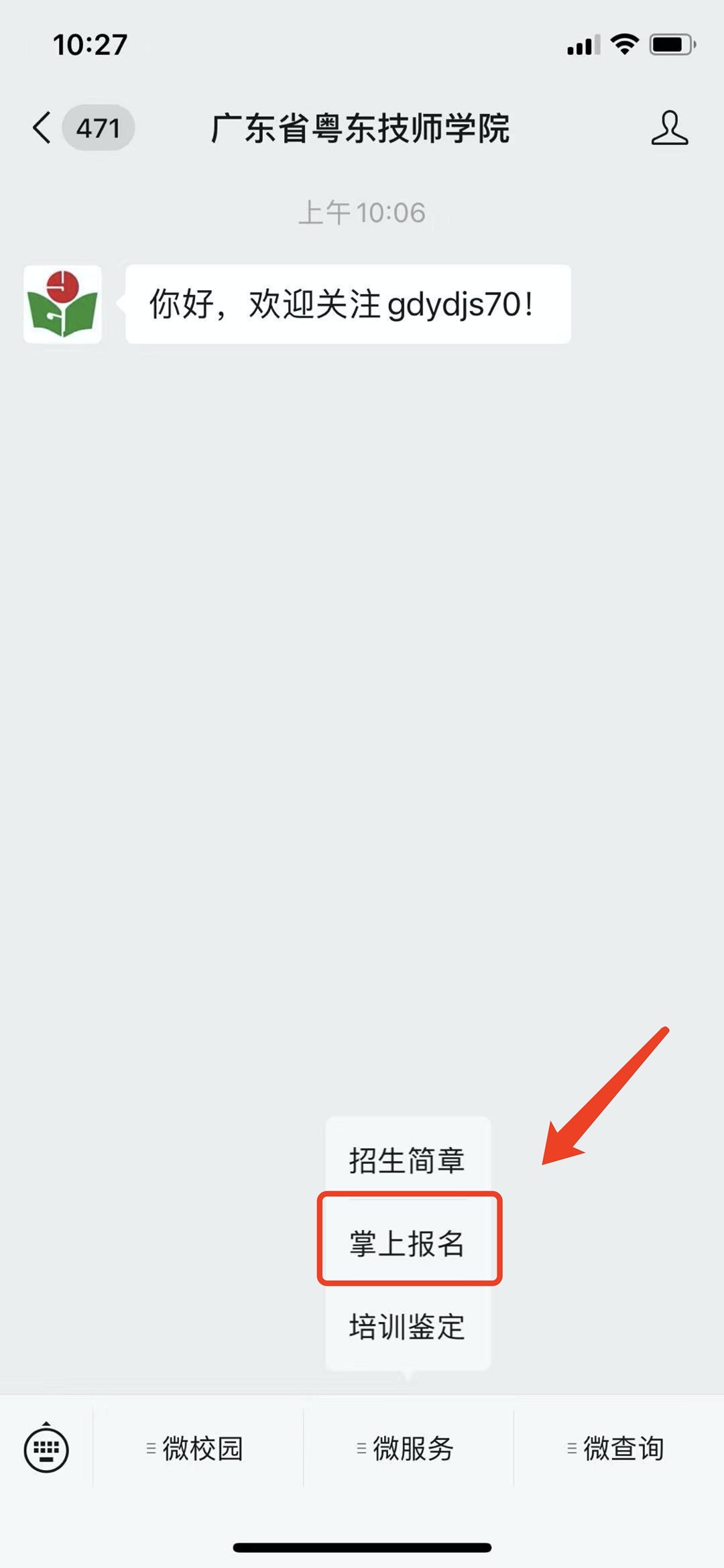 2、新生也可通过手机关注登录学院微信官方公众账号后,点击“微服务掌上报名”进行报名,微信号:gdydjs70。