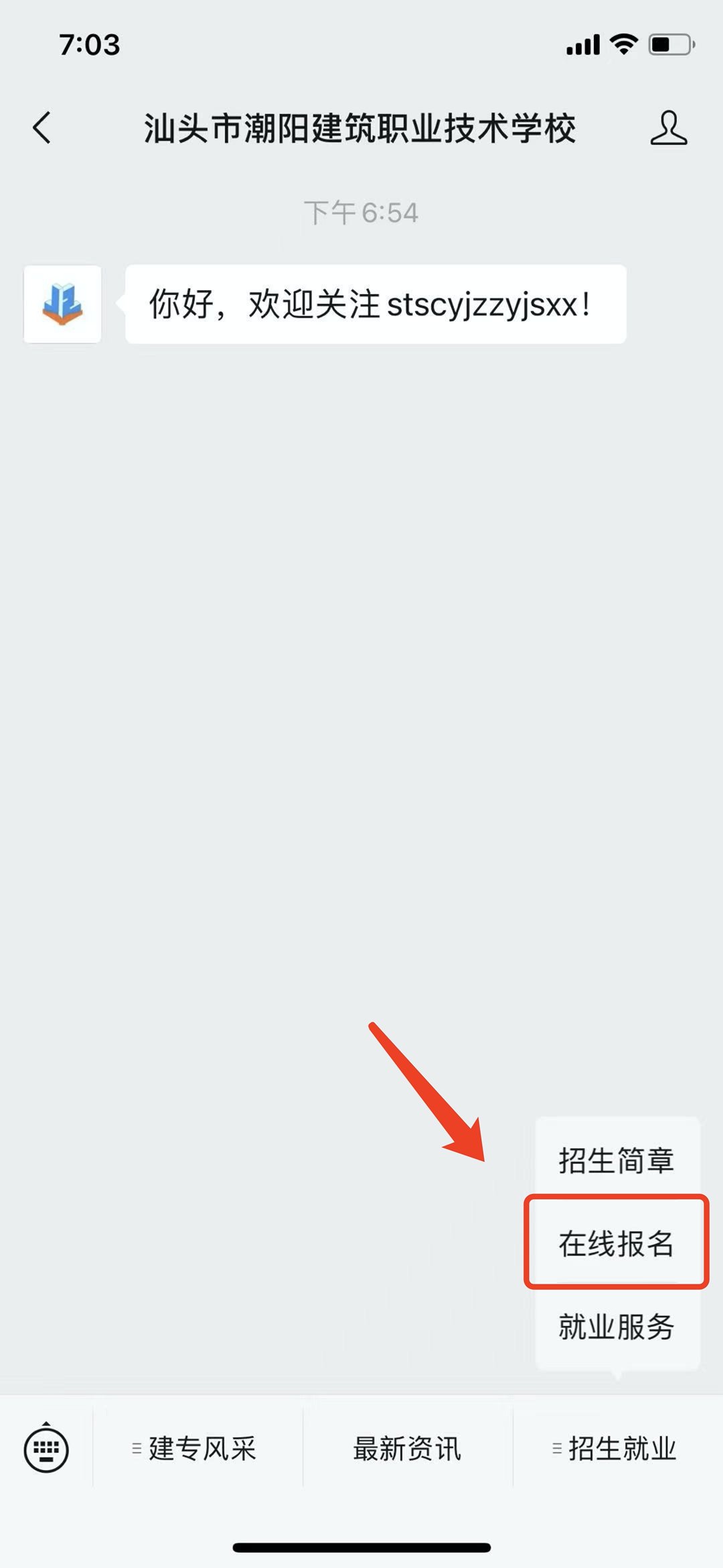 也可以进入“汕头市潮阳建筑职业技术学校”公众号选择下方【招生就业】点击【在线报名】。