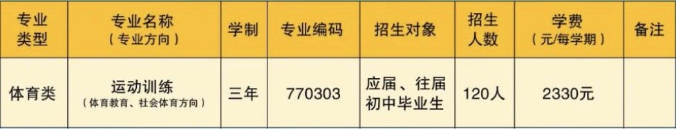 运动训练专业:学习文化基础理论、体育专业技能。开设有田径、游泳、游泳救生、体操、篮球、足球、武术、健美操等主要体育技能科目及十一个专项训练项目。对完成教学计划全部课程及实训实践环节并经过考核合格的学生,发给国家承认的中等职业教育学历证书。学校辅助学生通过相应考试可获得国家有关主管部门颁发的社会体育指导员和裁判员等级证书、救生员证书等国家职业资格从业证书以及体育技能等级证书。