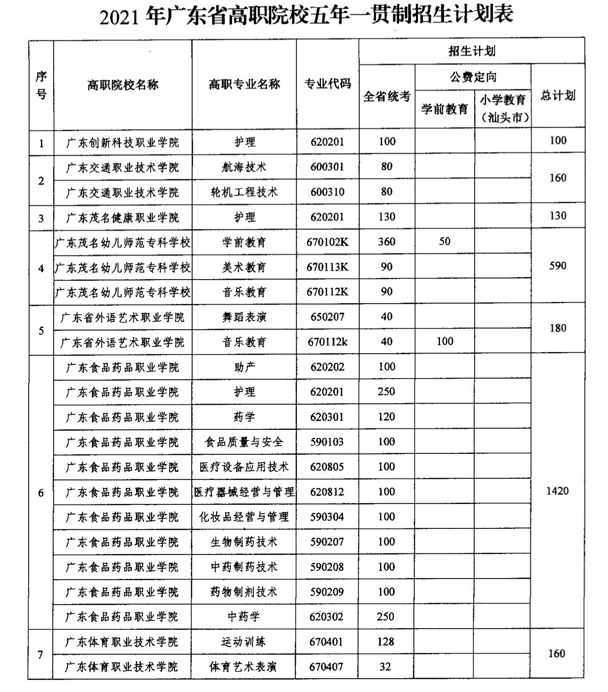 2021年招生院校及招生专业计划,详见《2021 年广东省高职院校五年一贯制招生计划表》。