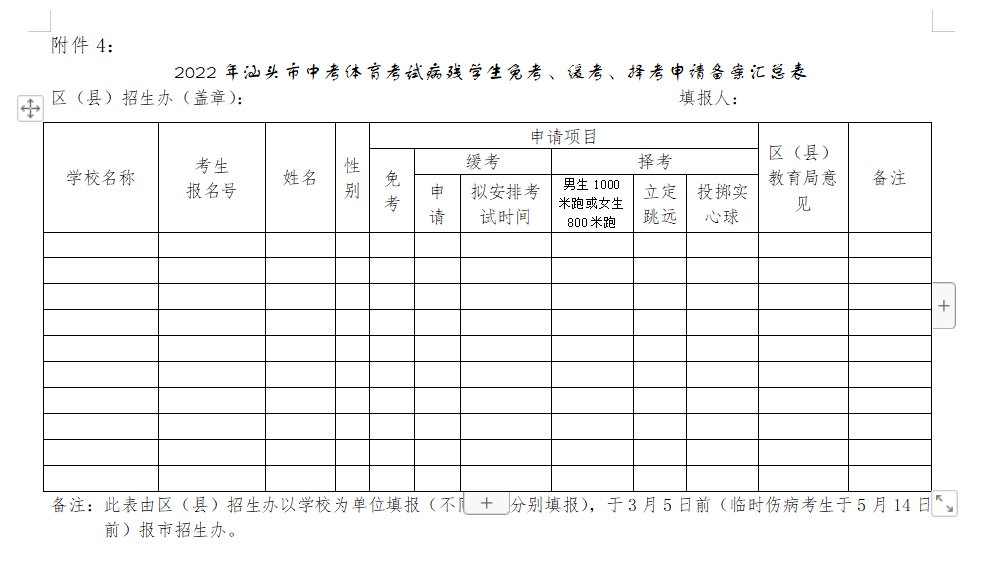2022年汕头市中考体育考试病残学生免考、缓考、择考申请备案汇总表:点击下载