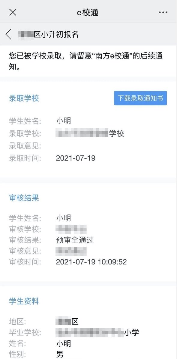 查询流程:结果公布后家长会在“南方e校通”收到通知,然后点击消息详情就可以查看具体录取信息。