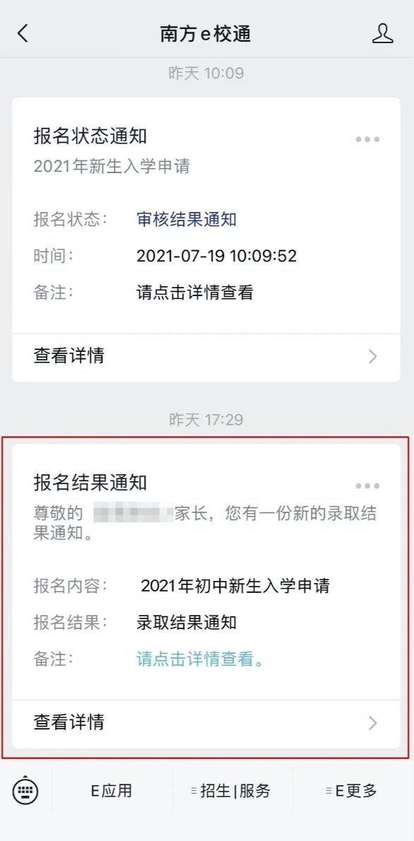 2021年汕头市龙湖区、金平区、濠江区、潮阳区小学、小升初入学招生摇号工作正在陆续进行中,招生录取结果将陆续通过【南方e校通】推送给家长,家长收到通知后,点击消息详情进行查看。