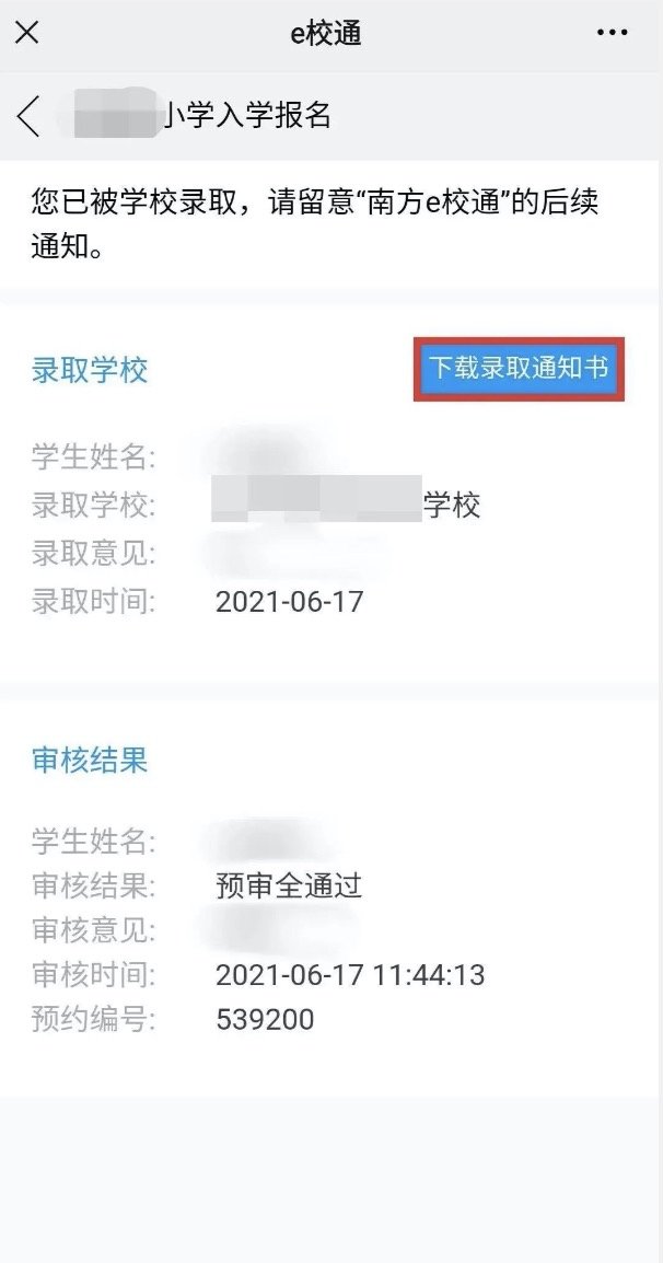 获取录取结果后,家长可点击【下载录取通知书】,根据提示下载录取通知书,如图所示:
