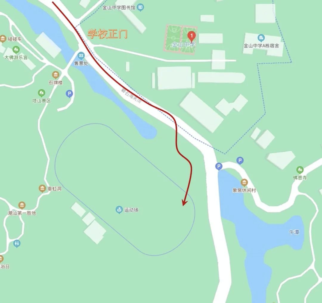 1. 驾车来校的家长和新生:沿礐石风景区龙珠路从金中运动场入口经天桥进入校园。车辆可停放在金中运动场地下车库,办理完报到手续的请经天桥返回地下车库,尽快驶离车库,以便车库车位能及时周转。