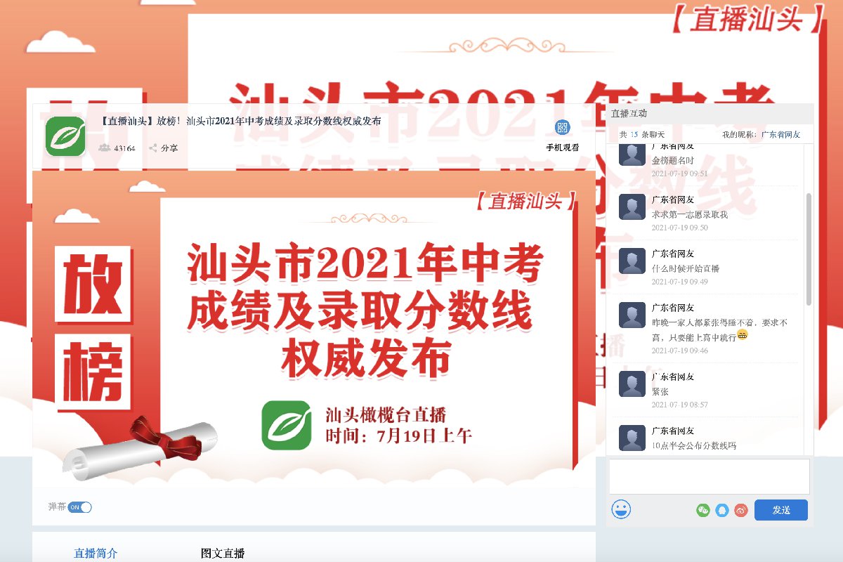 直播内容:7月19日上午10点30分,汕头橄榄台将进行现场直播,第一时间发布汕头市2021年中考成绩和录取情况,并连线采访市教育局和多所国家级示范性普通高中相关负责人介绍学校和新生注册登记等情况。