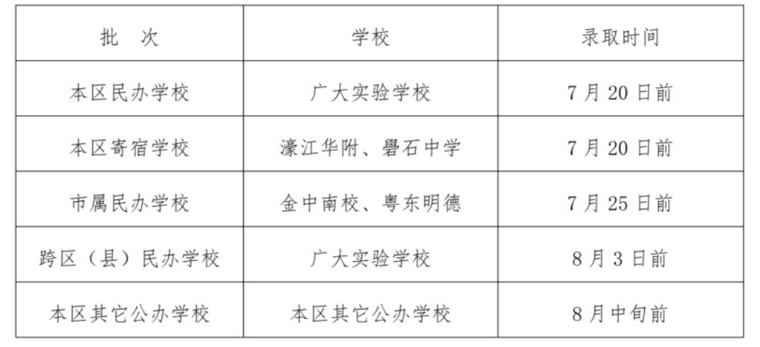答:每个批次的录取结果在“濠江区中小学招生入学服务平台”公布,并通过微信推送信息,其中电脑随机摇号的学校当场公布录取结果。录取学校对招生结果进行公示。各批次录取时间为: