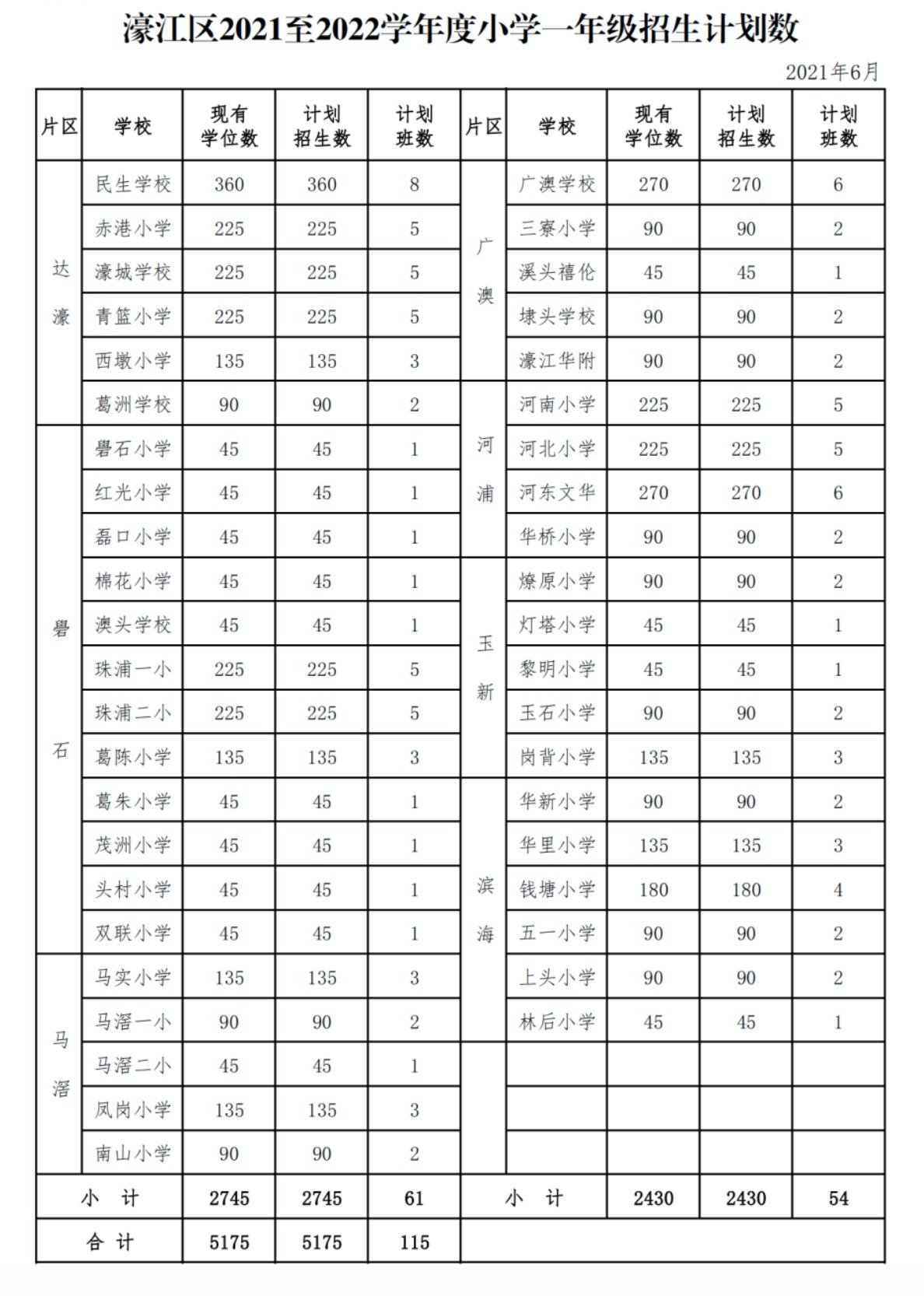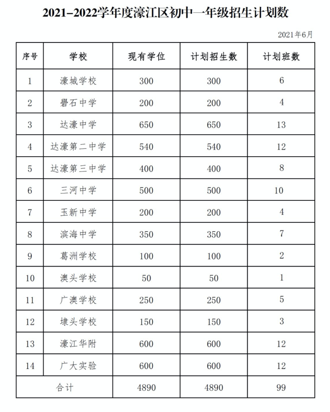 2021汕头濠江区小学、初中招生计划数