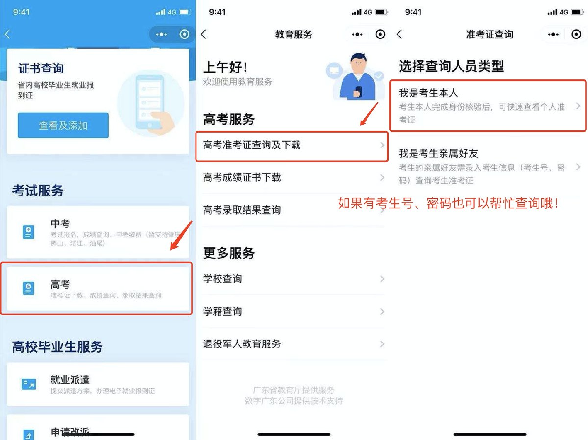 ③再选择“高考”,点击“高考准考证查询及下载”,通过考生号和密码登录即可查看准考证或将其发送至考生指定邮箱进行存档打印。