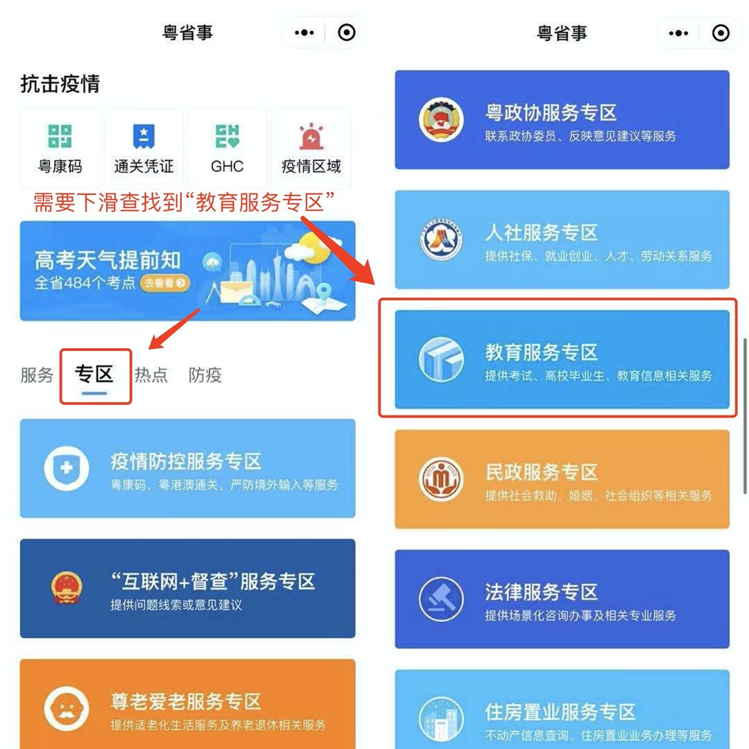 ②进入“粤省事”小程序,点击“专区”板块,选择“教育服务专区”。
