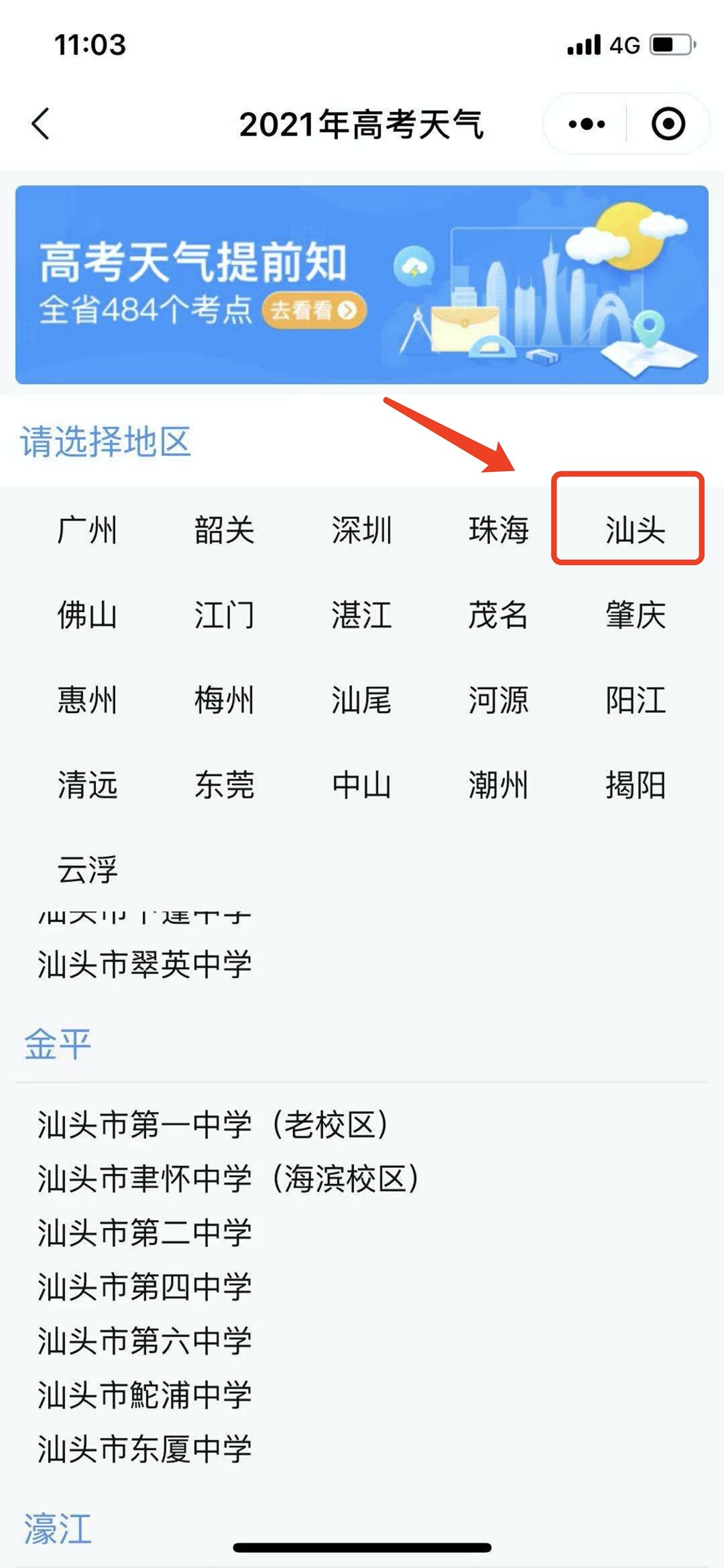 ③蓝色区域点击可以选择城市,将城市切换至“汕头”即可查看汕头地区的考点。