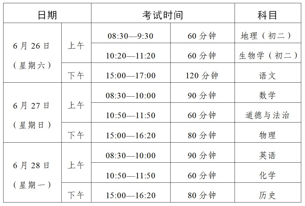 非委托省命题地市初中学业水平考试相应科目的考试时间,由相关市自行确定。初中学业水平考试体育与健康等科目及物理、化学、生物实验操作统一考试具体考试时间,由各地市根据本地实际情况确定。
