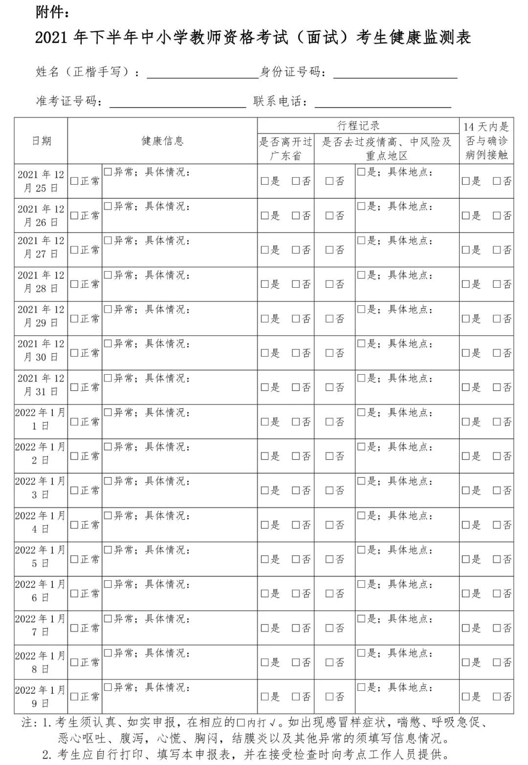一、考生须做好考前14天每日身体健康状况监测,如实记录个人健康信息,并在进入考点时提交《2021年下半年中小学教师资格考试(面试)考生健康监测表》。